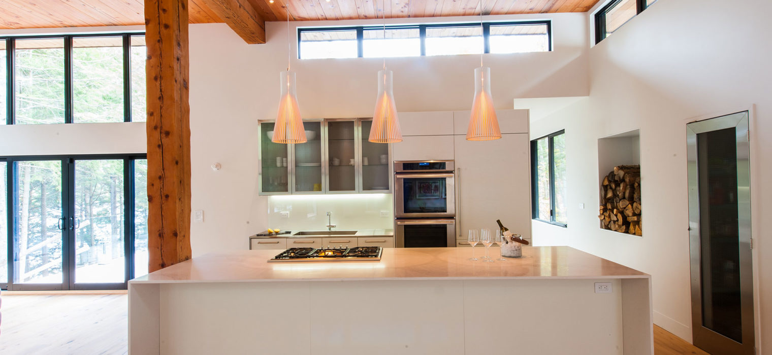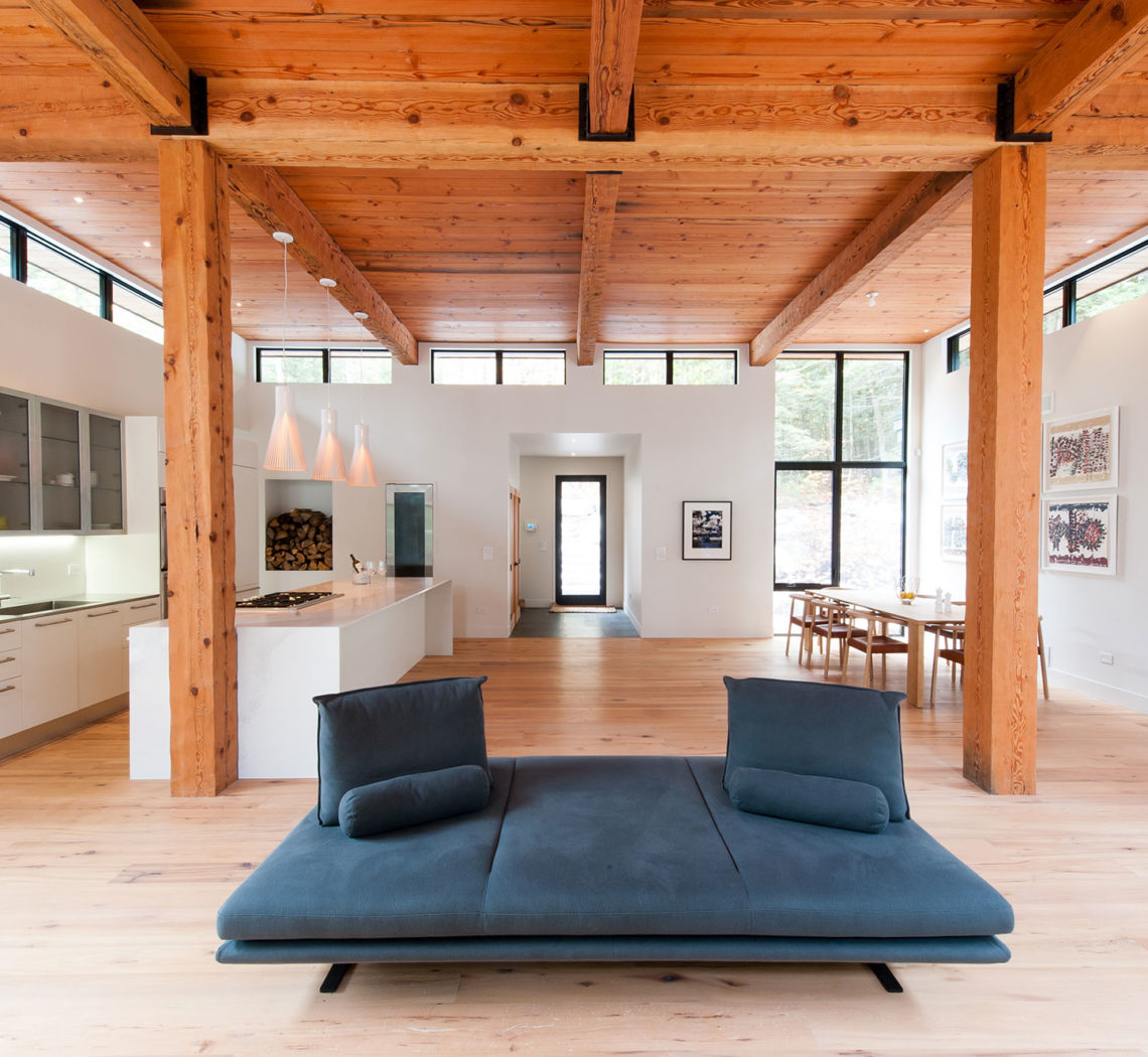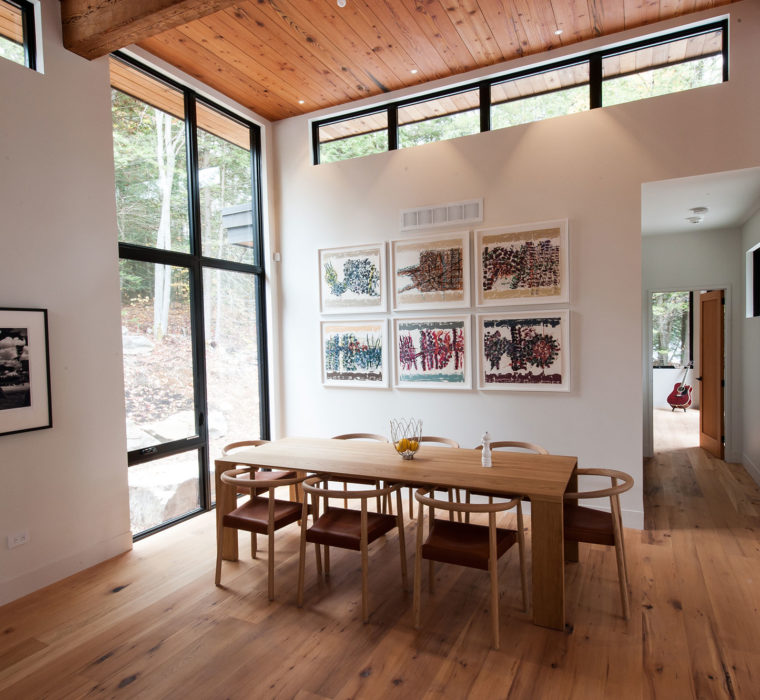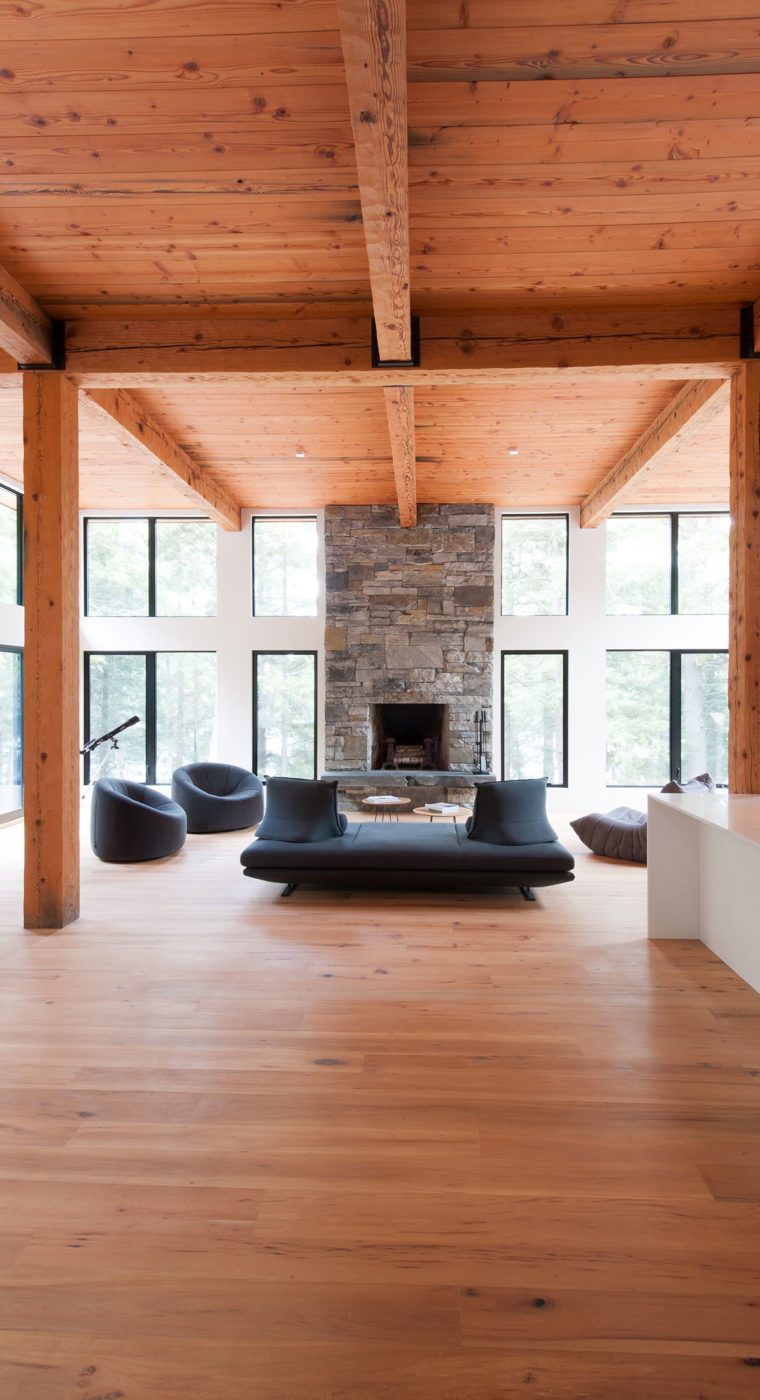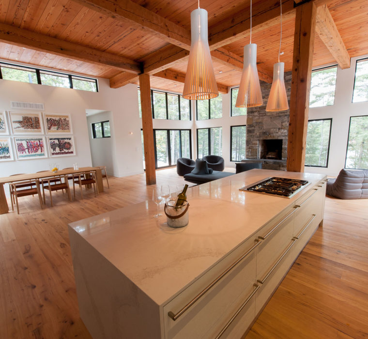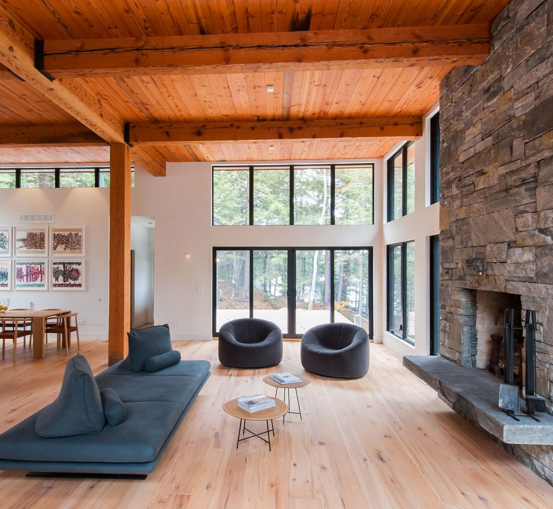 This contemporary home located on Lipsy Lake is an open concept space with soaring wood beams and floor to ceiling windows. Luxe details and natural materials blend seamlessly to create a beautiful minimalistic home.